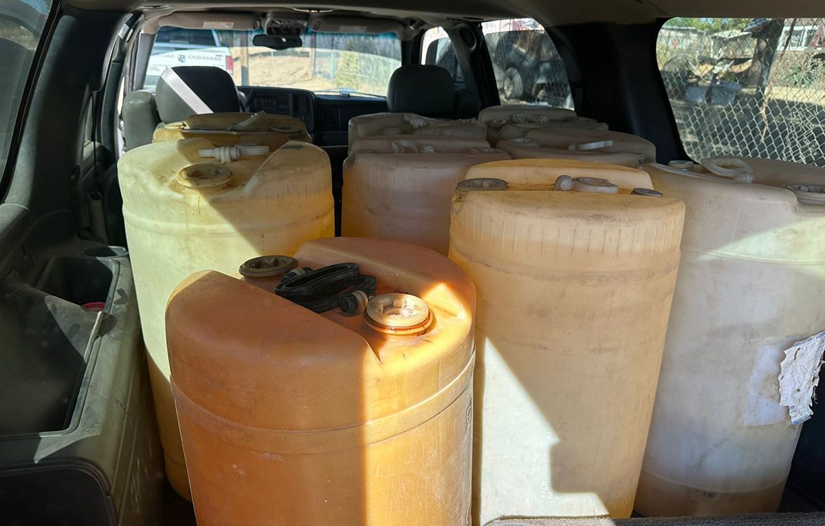 Fue en las inmediaciones del poblado de El Hongo, en donde los agentes de la FESC recorrían la zona de terracería localizando un vehículo Chevrolet Suburban de color blanco modelo 2002 el cual estaba en situación de abandono, por lo que se aproximaron a revisar encontrándose al interior un total de 8 contenedores de plástico llenos en su totalidad de gasolina, así como uno más que se encontraba a la mitad de su capacidad.