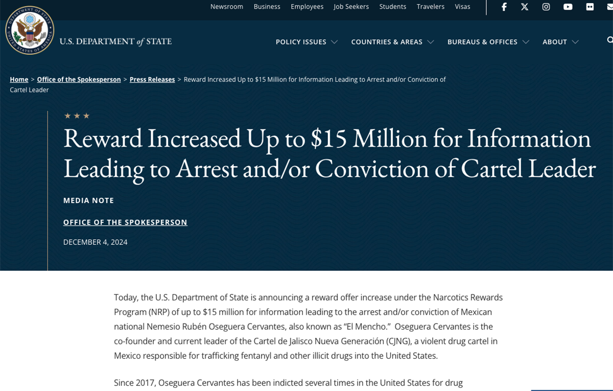 Para más información, puede consultar el siguiente comunicado: https://www.state.gov/reward-increased-up-to-15-million-for-information-leading-to-arrest-and-or-conviction-of-cartel-leader/