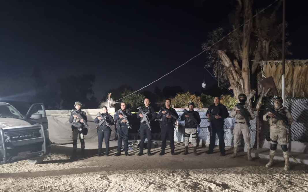 Agentes de la Fuerza Estatal de Seguridad Ciudadana (FESC), Secretaría de la Defensa Nacional (DEFENSA) y Guardia Nacional (GN) mantienen en resguardo un domicilio en la zona del Valle de Mexicali, luego de haber asegurado pastillas de Fentanilo ilegal tras atender una denuncia anónima realizada por un ciudadano a la línea 089.