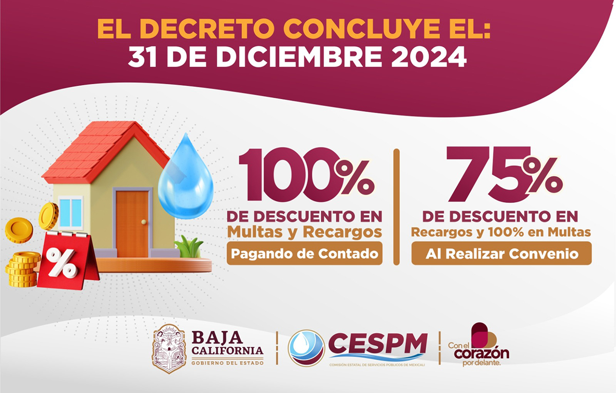 La Comisión Estatal de Servicios Públicos de Mexicali (CESPM) recuerda a sus usuarios que el decreto que condona multas y recargos por adeudos de agua potable llegará a su fin este 31 de diciembre de 2024. Este beneficio, vigente desde meses atrás, ha sido una herramienta clave para apoyar a los hogares y negocios de Baja California.