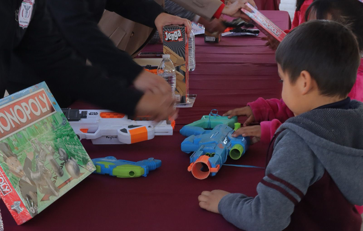 “Hoy están tomando una decisión importante, cambiar un juguete bélico por uno didáctico, este pequeño gesto tiene un gran significado, porque cuando decimos adiós a los juguetes de guerra estamos diciendo sí a la paz, al respeto y a la amistad”, expresó Tovar López.