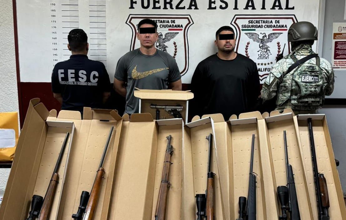 Agentes de la Fuerza Estatal de Seguridad Ciudadana (FESC) y elementos de la Secretaría de la Defensa Nacional (DEFENSA) detuvieron a dos presuntos delincuentes durante un despliegue operativo implementado en la zona del Valle de Mexicali; los individuos, quienes cuentan con antecedentes criminales en Estados Unidos por conspiración de tráfico de drogas, estaban en poder de ocho armas de fuego de diferentes calibres y 110 cartuchos útiles.
