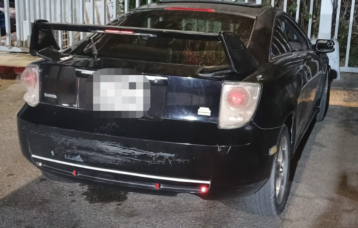Durante la vigilancia, los agentes detectaron un vehículo Toyota Célica, color negro, modelo 2001, con placas de California, cuyo conductor incurrió en una infracción de tránsito. Al realizar la intervención, se percataron de que el joven de 18 años no contaba con registro vigente del automóvil ni licencia de conducir, por lo que procedieron a trasladarlo a los patios de la comandancia central.