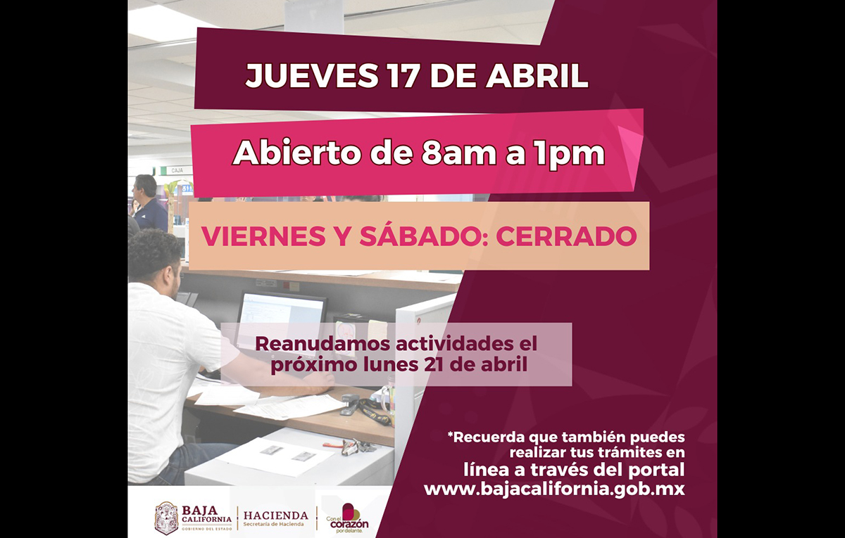 El Servicio de Administración Tributaria de Baja California (SAT BC) informa que el próximo viernes 18 y sábado 19 de abril las oficinas de recaudación de rentas y módulos del Repuve permanecerán cerradas con motivo de los días de semana santa.