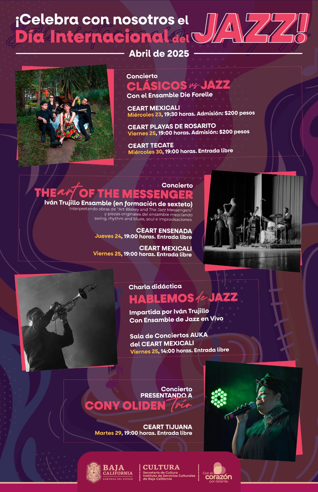 La Secretaría de Cultura de Baja California celebrará del 24 al 30 de abril, con charlas didácticas y conciertos, el Día Internacional del Jazz, que se fue proclamado por la UNESCO, con el objetivo de destacar este género musical como una herramienta para fomentar la paz, el diálogo entre culturas y la diversidad.