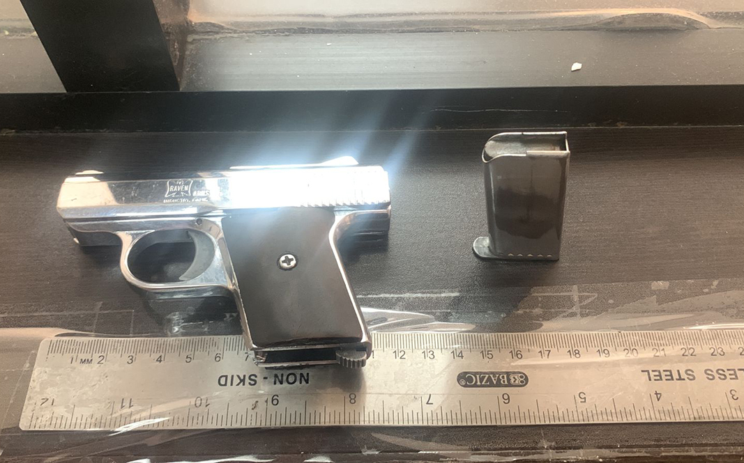 El arma de fuego asegurada fue una pistola calibre .25, con la leyenda “Raven Arms Industry, Model MP-25 CAL-.25 Auto Made in USA”, color cromo, con cachas de madera de color café y un cargador sin cartuchos útiles, sin serie visible.