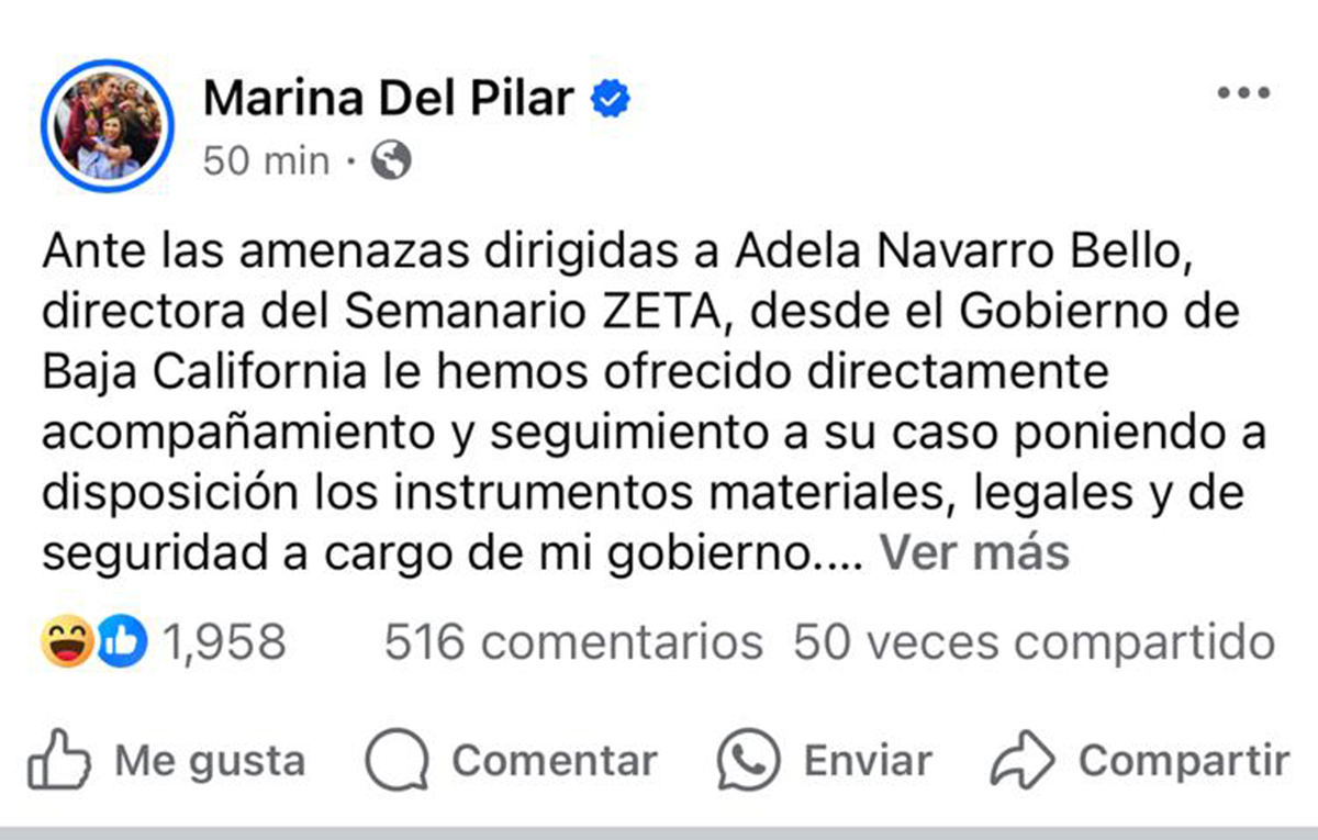 “Ante las amenazas dirigidas a Adela Navarro Bello, directora del Semanario ZETA, desde el Gobierno de Baja California le hemos ofrecido directamente acompañamiento y seguimiento a su caso poniendo a disposición los instrumentos materiales, legales y de seguridad a cargo de mi gobierno.
