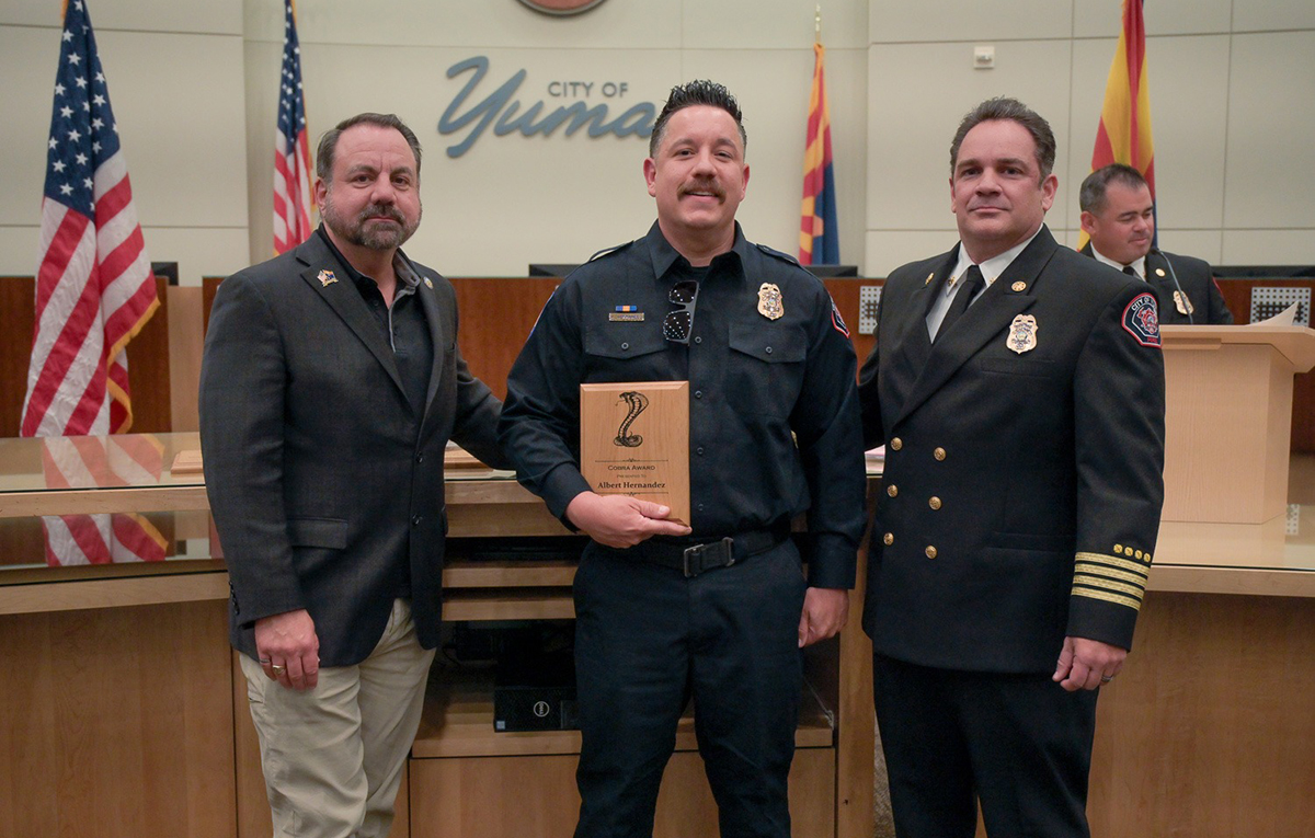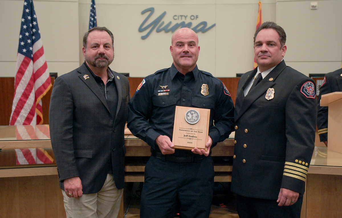 Firefighter/Paramedic Jeff Endres was recognized as Paramedic of the Year. As a paramedic, one must be decisive, command a scene, delegate tasks, and handle oneself with composure in the most intense and critical moments. Jeff Endres excels in these situations! Time and time again I have witnessed Jeff rise to the occasion, taking command, and making the critical decisions necessary for the best outcomes for his patients. He is the epitome of a firefighter, and a highly respected and skilled paramedic for the City of Yuma. The acknowledgement of his professionalism and excellence is long overdue. Jeff is an exceptional paramedic and incredible role model to all at YFD. Jeff always looks after his fellow medics, often taking the calls himself or offering his assistance during transport. Jeff is as vital to his crew as he is to the patients being tended to, and it is without question that the scenes run smoother, and the outcomes are far greater when Jeff is leading the scene!