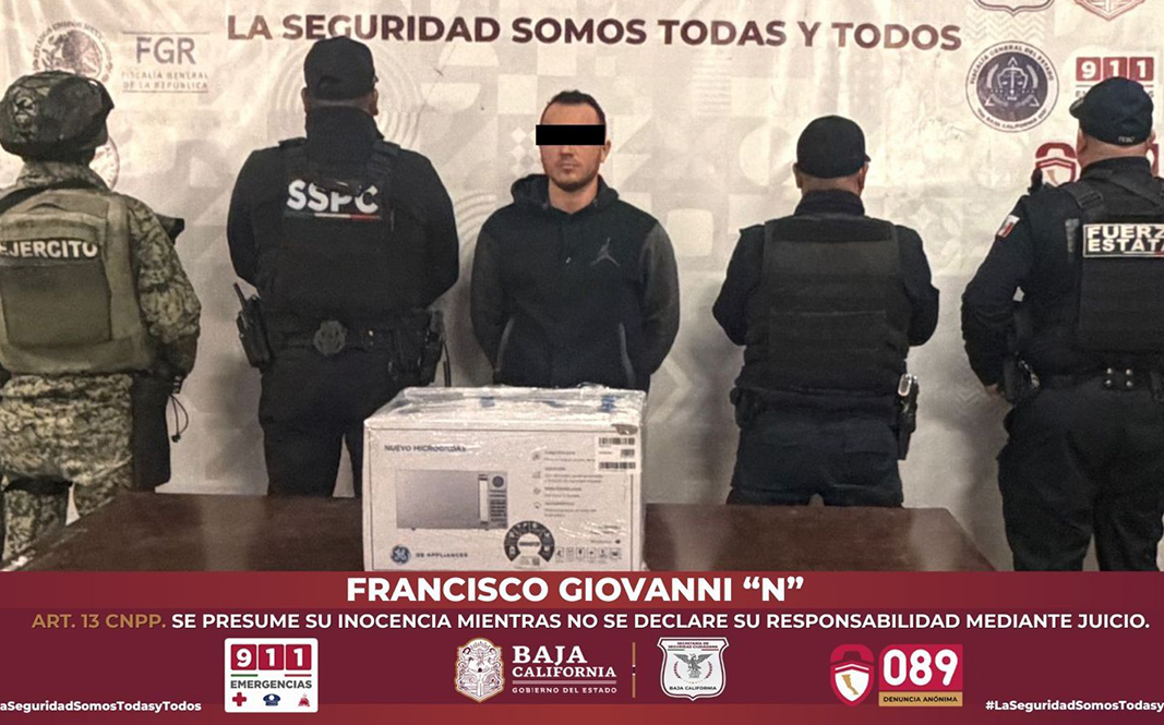 El tripulante se identificó como Francisco Giovanni “N”, de 33 años y originario de Tijuana. Durante la interacción el conductor se dirigió con palabras altisonantes contra los oficiales, motivo por el que se procedió a llevar a cabo una inspección. Fue sobre el asiento del conductor que se encontró una caja con la leyenda “Nuevo Microondas”, con paquetes al interior, confirmando la presencia de la droga, con un peso aproximado de 4.340 kilogramos