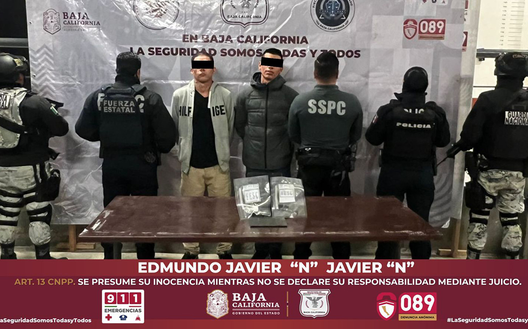 En acciones de prevención del delito en la colonia Zona Norte, agentes de la Secretaría de Seguridad Ciudadana de Baja California (SSCBC), en coordinación con la Guardia Nacional (GN) y la Secretaría de Seguridad y Protección Ciudadana (SSPC) Federal, detuvieron a dos hombres y aseguraron diversas dosis de droga.