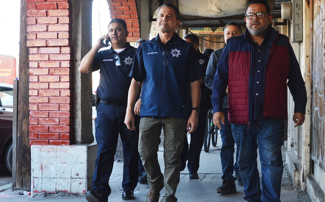 Con el fin de conocer de primera mano las inquietudes de las y los comerciantes del Centro Histórico de la ciudad de Mexicali previo a los trabajos operativos y preventivos enfocados a la temporada decembrina, el director de Seguridad Pública Municipal, Luis Felipe Chan Baltazar, recorrió la mencionada zona en compañía de su primer cuadro de mando y el delegado Rubén Hernández Chen.