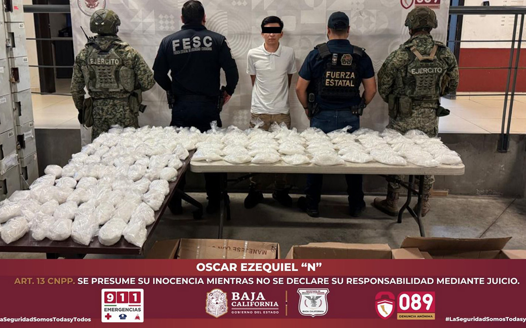 El decomiso de 39 kilogramos de metanfetamina y la captura de un presunto generador de violencia son parte del resultado de un operativo que agentes de la Fuerza Estatal de Seguridad Ciudadana (FESC) ejecutaron en la colonia El Florido 1ra Sección; el cargamento era movilizado en una unidad con rótulos de transporte público, con lo que se evitó la distribución de miles de dosis en las calles de Tijuana.