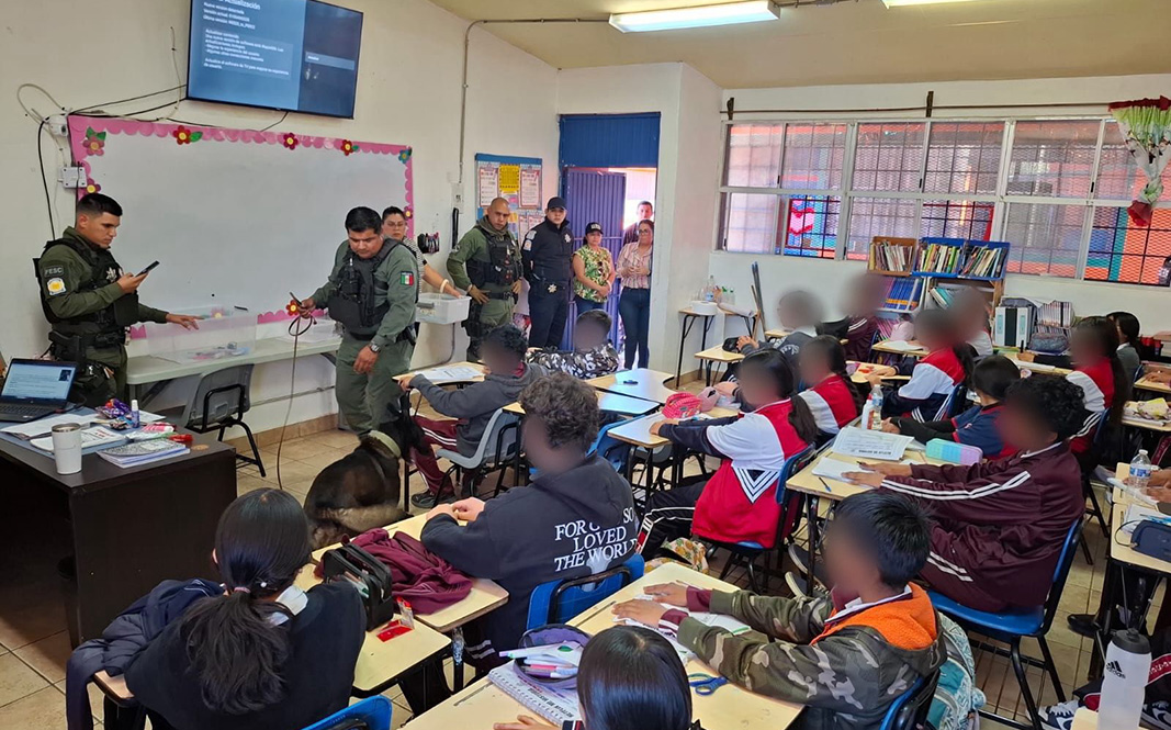 La actividad se realizó en la Escuela ubicada en la colonia Morelos, con la participación de personal de la Dirección de Proximidad Ciudadana, la Unidad de Operaciones Caninas de la Fuerza Estatal de Seguridad Ciudadana (FESC) con el binomio Black, así como autoridades escolares.