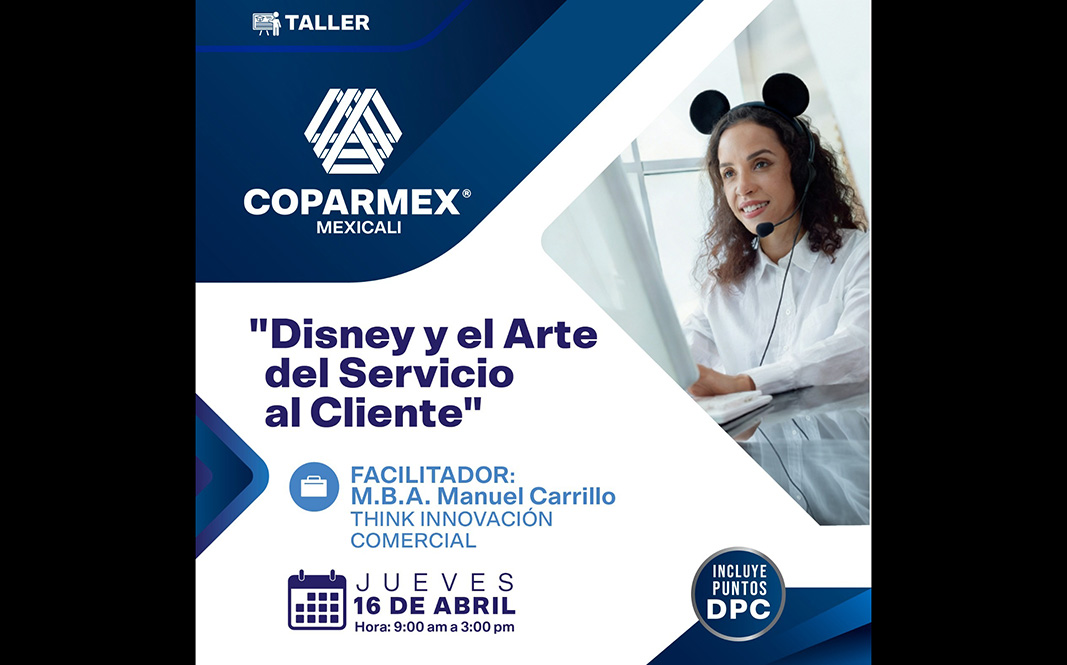 Fortalecer las capacidades del capital humano en las empresas y elevar la calidad en la atención al cliente, es el objetivo del taller “Disney y el Arte del Servicio al Cliente”, que Coparmex Mexicali ofrece al público interesado.