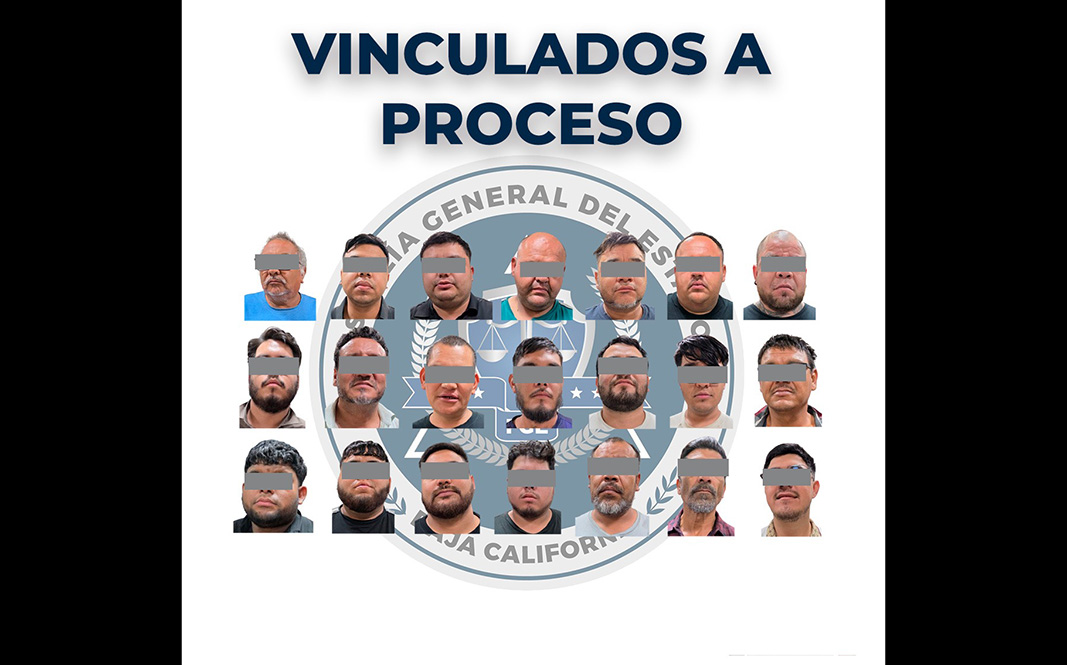 MEXICALI.- Como resultado de la sólida integración de la carpeta de investigación de la Fiscalía General del Estado a cargo de la Dra. Ma. Elena Andrade Ramírez se obtuvo el auto de vinculación a proceso en contra de 21 personas detenidas tras un operativo (cateo) desplegado el pasado 10 de abril.