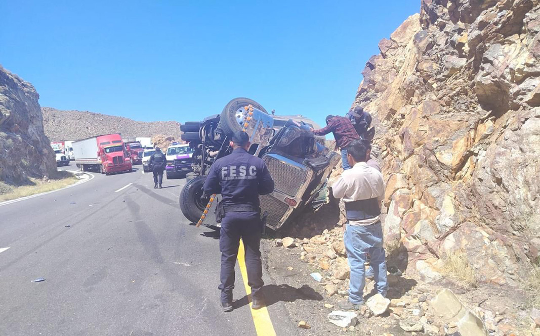 El hecho se registró alrededor de las 14:14 horas a la altura del kilómetro 23, en el tramo descendente, donde personal estatal detectó la unidad de carga volcada sobre su costado izquierdo.